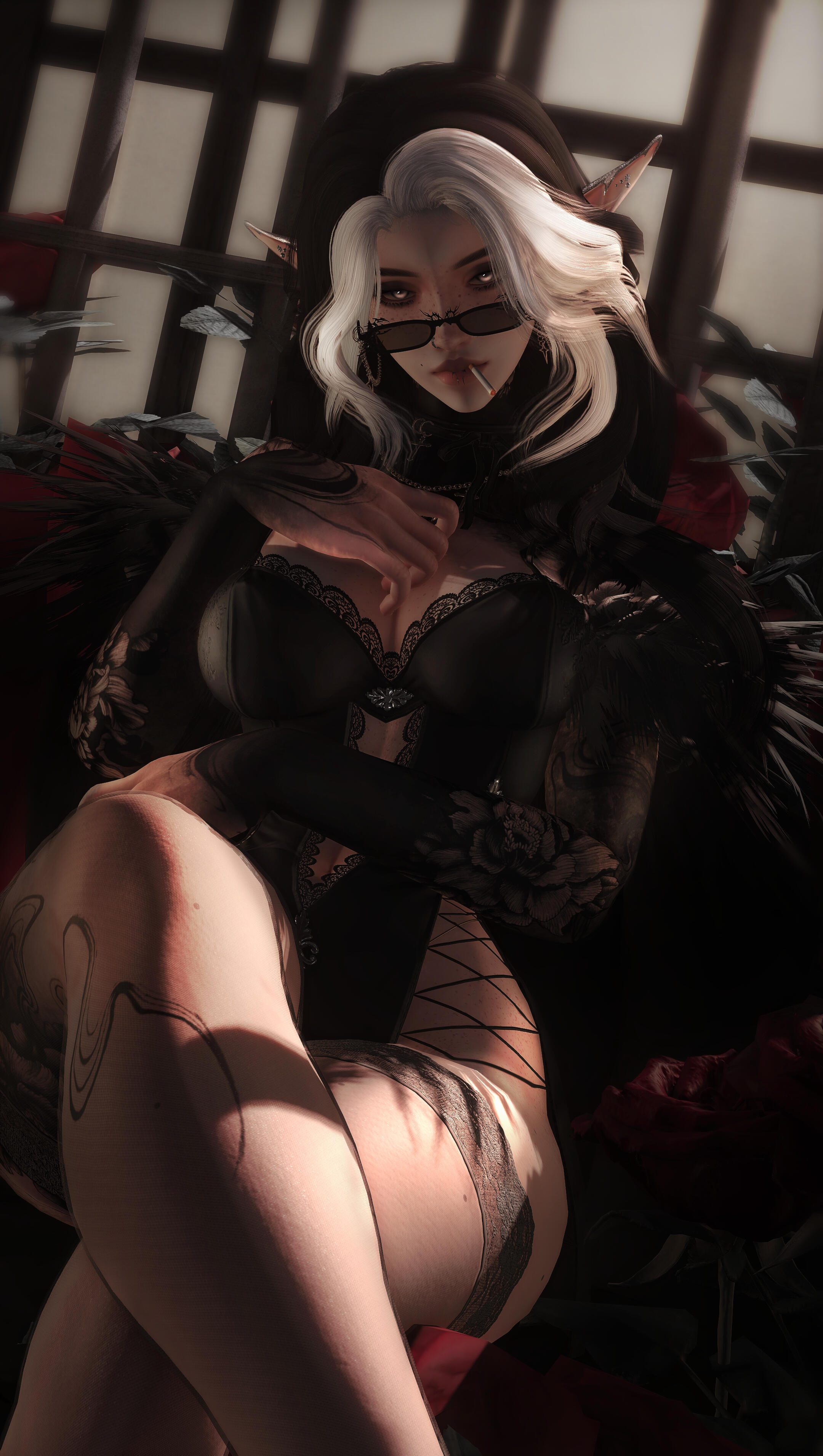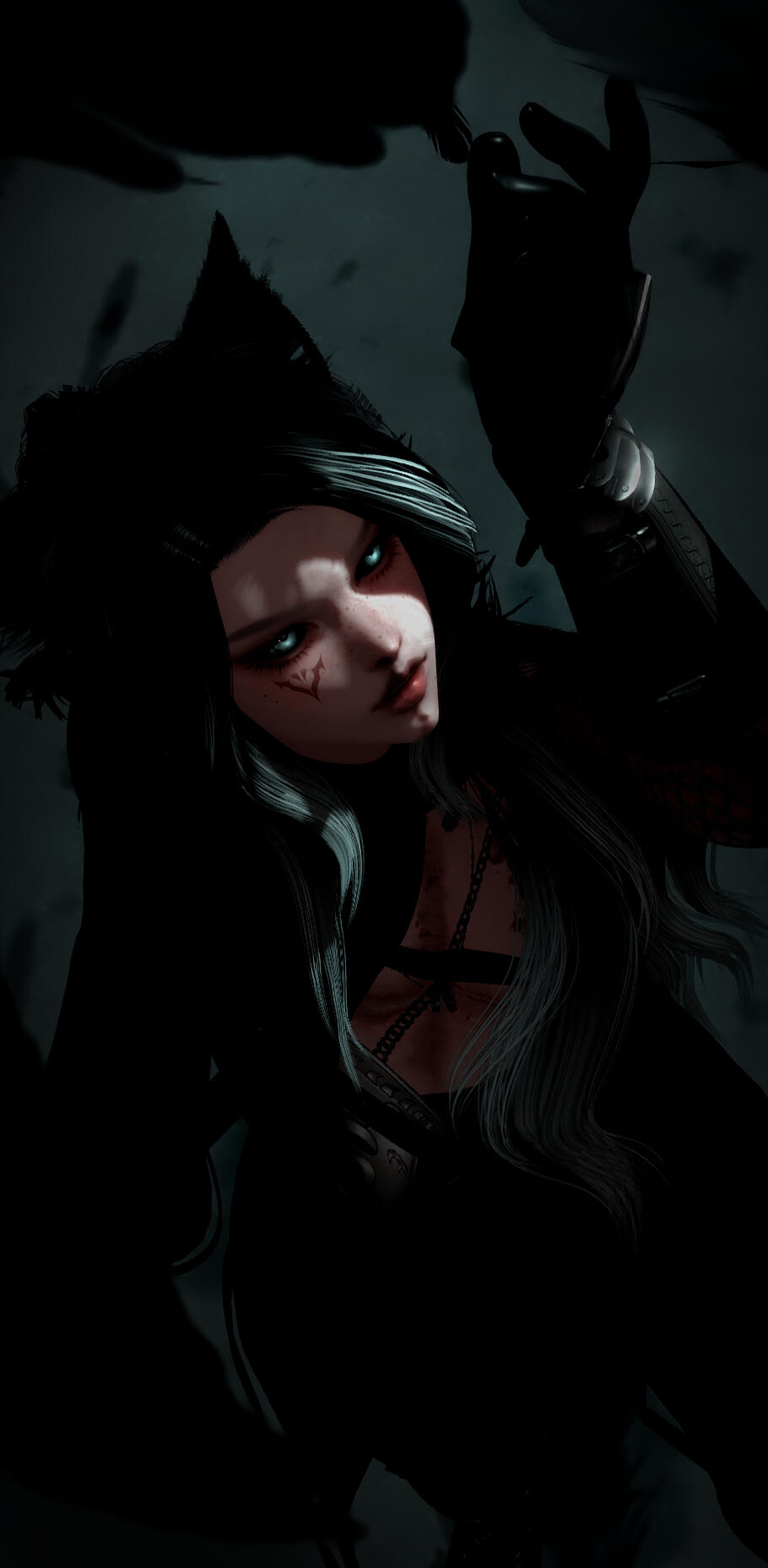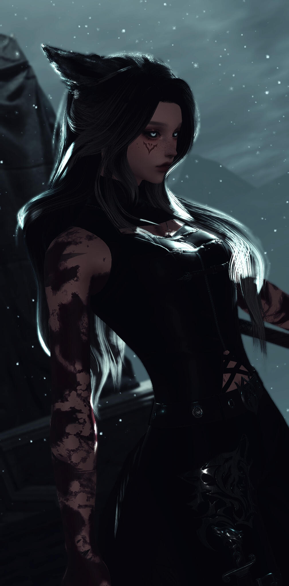 As Crowe immersed themselves deeper into the shadows of Ul’dah, their reputation grew. The city’s underworld, once a maze of unfamiliar faces and hidden agendas, became a place where Crowe could navigate with precision, like a spider weaving a web. They formed alliances with those who recognized their value, from the elusive black market dealers to the dangerous street gangs, each providing another piece to the puzzle of Ul’dah’s corruption. Every day, the weight of the choices they made grew heavier, but Crowe had long learned to compartmentalize their emotions, burying them beneath a hardened exterior. Trust was a commodity they no longer gave freely, and loyalty was a fragile thing in a world where betrayal was a constant companion.Their brother’s absence left a hollow ache within them, one that never quite healed. Yet, with each day spent in the streets of Ul’dah, in the company of those who lived and died by their own rules, Crowe found themselves adapting to a new normal. They wore their brother’s ambition like a second skin, pushing forward with the same ruthlessness that had once driven him. In a way, they had become the shadow of the person they had once looked up to, stepping into shoes that felt both foreign and inevitable. Every case they solved, every piece of information they uncovered, became another step toward unraveling the twisted web that Ul’dah had become—a web that, despite their growing power, still held them tightly in its grip.It was not long after that when death finally claimed them. Crowe had always been fiercely loyal—loyal to a fault—and that devotion bound them irrevocably to another who led their former organization. When the call came, they did not hesitate. They willingly stepped into the void to shield those around them, to enter a realm that had only ever given them pain and suffering, and in doing so, they were consumed by the very thing they despised most. Yet death was not the end. From that sacrifice, Crowe was remade into something unnatural—a creature, a cryptid of the void—born not of ambition or hunger for power, but of sheer, unyielding loyalty. Now bearing a new alias, Lady Crowe walks the world as a husk of who they once were, their existence caught between hatred and obligation. They wander in search of answers, haunted by what they have become, bound to a fate they never wanted, and driven by the quiet need to understand whether anything of their former self can still be reclaimed.